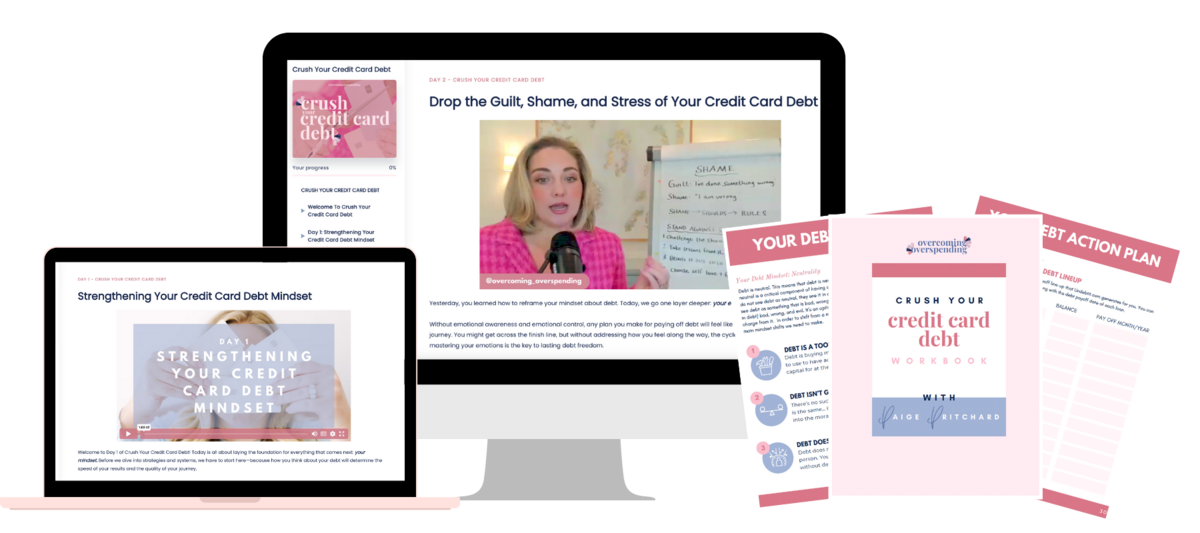 Crush Your Credit Card Debt is a self-paced course, which means there’s no direct coaching or personalized support included. If you’re looking for live coaching and high-touch guidance, that’s available inside my signature program, Overcoming Overspending.