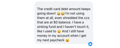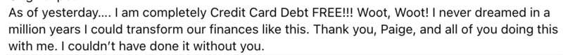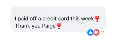 At 44 years old I have been through the cycle of running up my credit cards and paying them off multiple times and knew I needed to do SOMETHING different to change my old habits. Paige's work has genuinely helped me create a mindset shift about the habits that kept getting me into debt. I hope to be debt free by the end of 2025. Paige’s coaching has also motivated me to sell things I already own and use the proceeds to pay on current debt. I’ve made over $700 so far and have a lot more things I’ve found to let go of.