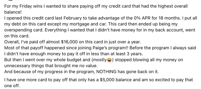 I have been learning from Paige for 2+ years. Not only have my finances improved but my relationship with money and how I spend has been transformed. I was able to pay off over $5,000 of debt using Paige’s methods and reframing my mindset around how I view my debt. I look forward to every coaching call with Paige as she shares her knowledge of money and psychology around spending. Her program has truly been life changing for me. Thank you Paige!